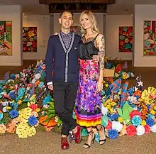 In the summer of 2018, DabsMyla's indoor floral installation, covering a wall with 3,000 paper flowers and a trio of paintings, was featured in Beyond the Streets and hailed as one of "Top 10 Must See Art Works" of the show.[11] Later in 2018, their "Things That Can't Be Seen" exhibition transformed the former Taschen Gallery in Beverly Grove with a mural on the outside and large-scale original paintings and installations inside. The work featured autobiographical elements and California-inspired imagery throughout. Critics said the work has "linked past and present, fiction and nonfiction" adding that "in their imaginative works, the world of DabsMyla continues to grow." Floral accents and design were provided by Birch & Bone.[12]