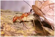 Workers are visual predators that hunt diurnally; by keeping their long trap-jaw mandibles open to ca. 180° they are frequently able to capture a wide range of prey, including relatively large items that they retrieve in groups of up to six ants. During prey capture, the workers can sting the prey; their poison gland contains a mixture of pyrazines.[3] Through group-hunting, short-range recruitment and spread-eagling prey, workers can capture a wide range of arthropods, the largest weighing up to 90 times the weight of an ambushing worker.[3][8] Daceton armigerum workers ambush mostly on their host-tree branches. Ambushing workers detect prey by sight and can begin their lightning approach before the prey has landed, striking them immediately.[8]