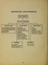 The report was completed rather quickly, within the span of one to two weeks.[8][9] The report is divided into four parts, listed in a table of contents on the third page of the document. Part I features the foreword by William Wilson Quinn while Part II was prepared by the Office of Strategic Services. Part III was prepared by the Psychological Warfare Branch and Part IV prepared by the Counter Intelligence Corps. Parts II to IV partly overlap thematically, since they were prepared as individual reports that were largely independent of each other. According to the preface, the reports were deliberately not combined into a common document with a uniform style, as doing so would have "seriously weaken[ed] [their] realism".[10] In the summary preceding the second part of the report, it noted that the report does not intend to be a comprehensive or exhaustive account of Dachau Concentration Camp, and that work was already being done on further, more comprehensive reports.[11] Thus, in preparation for the War Crimes Trial Program, American investigators conducted investigations from April 30, 1945 to August 7, 1945 to determine who was responsible for the crimes associated with the Dachau complex. This investigation report, completed on 31 August 1945, was the basis for the Dachau Camp Trial.[12]