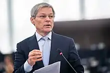 In January 2019, at the first national convention of PLUS, Cioloș was elected president of the newly emerged political party with 99.17% of the votes.[34] The following month, Cioloș announced the establishment of the 2020 USR-PLUS Alliance between PLUS and the Dan Barna-led Save Romania Union (USR).[35] That May, he was elected a Member of the European Parliament.[36] He subsequently became leader of the new Renew Europe political group, having secured support from En Marche, Ciudadanos and parties from Germany and the Netherlands.[37] He left that post in autumn 2021 in order to focus on domestic politics.[38]