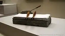 Dadeumidol are made of granite, agalmatolite, marble, etc. They are also sometimes made of solid wood such as birch wood or zelkova.[5][6] It was made from birch wood in Chungcheongdo or Hamgyeongdo, and in this case it was called the dadeumitdae (다듬잇대). The shape is a thick rectangle. The upper surface touching the fabric is made to be slightly wider and smoother than the underside so that the fabric does not hurt. There are four short legs on the four corners of the underside,[5][6] and both of side have grooves for carrying.[3] It is also called Chimseok (침석; 砧石).[5] Dadeumitbangmangi is a pair of two, made of wood.[8]