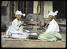 Dadeumi (Korean: 다듬이) or dadeumijil (다듬이질) or kinuta () is a Korean traditional ironing method where two women knelt on the floor, facing each other across a smoothing stone, beating out a rhythm on the cloth to press out its wrinkles and soften it.[1]Dadeumi requires dadeumitbangmangi (다듬잇방망이) and dadeumitdol (다듬잇돌).[2][3] The former is a bat that pounds on the cloth, and the latter is the stone under the cloth.