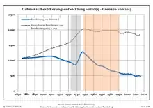 Development of population since 1875 within the current Boundaries (Blue Line: Population; Dotted Line: Comparison to Population development in Brandenburg state; Grey Background: Time of Nazi Germany; Red Background: Time of communist East Germany)