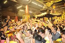 In modern times, temples that Mazu doesn't visit will sometimes send people to surround the litter and forcefully ask them to make a detour to their temple. In most cases, the litter bearers concede to these requests in order to avoid conflicts. However, violent brawls do occur if the two sides do not come to an agreement. Therefore, the procession is often accompanied by a large police presence to discourage litter stealing.[16][17]