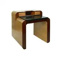 In 1974, Jackson's career as a designer began when Yoko Ono asked him to build a desk with hidden compartments for husband John Lennon.[26] "She wanted to make a piece of furniture that would be a mystical object; that would be like a Chinese puzzle," Jackson recalled in a 1986 interview published in the Chicago Tribune.[6] The result was a small cubed-shaped writing table with rounded corners reminiscent of Art Deco era style.[15] Touching secret pressure points opened the desk's compartments.[23] This commission helped build Jackson's reputation and allowed him to merge his experience as a magician and performer with his developing interest in furniture.[27]