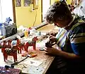 The blanks are sawed and carved by hand. Because of this, no two horses are exactly alike. The horses are dipped in primer immediately after carving, to reveal any defects in the wood that may need to be fixed. After priming, any cavities in the wood are filled in to ensure extra smoothness. The horses are polished to give them a smooth, attractive finish.