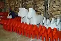 Today, many of the villages in Dalarna county make Dala horses with individual styles representing the district of origin. These horses also have distinctive shapes and often come in different sizes. Some horses like the Nusnäs horse are stocky work horses; others are lean and upright with stately countenance like the Rättvik horse. Many of these can be seen at a yearly exhibition (since the year 2000), which is held at Klockargården in Leksand, Sweden. Currently about forty present carvers and painters show their Dala horses and put them up for sale.