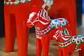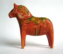 A Dalecarlian horse or Dala horse (/ˌdɑːləˈkɑːrliən/;[1] Swedish: Dalahäst) is a traditional carved, painted wooden statue of a horse originating in the Swedish province of Dalarna (Dalecarlia). In the old days the Dalecarlian horse was mostly used as a toy for children; in modern times it has become a symbol of Dalarna, as well as of Sweden in general. Several types of Dalecarlian horses are made, with distinguishing features common to the locality of the site where they are produced. One particular style has, however, become much more common and widespread than others. It is stoutly carved and painted bright red with details and a harness in white, green, yellow and blue.