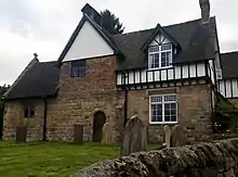 All Saints' Church and Verger's House, Dale Abbey, Derbyshire, viewed from footpath. The church was probably the abbey's infirmary chapel but the site is thought to be that occupied by the chapel of the hermit and the Gomme.