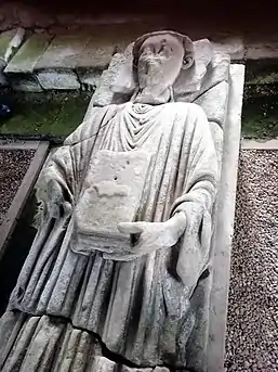 From the Premonstratensian point of view, Dale Abbey was founded in 1204 from Newsham Abbey in Lincolnshire.[2] However, the chronicle of the abbey, which dates from the mid-13th century,[3] gives a long and detailed prehistory. The author of the chronicle was Thomas de Muskham: the initial letters of the various sections of the foundation legend make up the name T. H. O. M. A. S. D. E. M. V. S. C. A.[4] Thomas did not trust in the detective work of later generations, but tells the reader explicitly that his name is in the capital letters of the text.[5] Muskham's chronicle places the origins of the abbey early in the previous century and credits the initiative not to a monastic order or member of the landowning class but to a local working man.