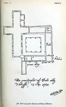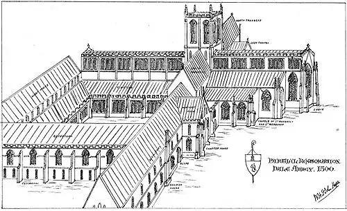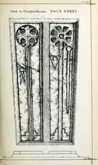 William FitzRalph left his daughter and her husband to work out the details of the new foundation, pleading the urgency of the king's business overseas. The couple went to meet Abbot Lambert of Newsham or Newhouse Abbey and secured from the chapter a delegation of nine canons to establish a colony at Deepdale.[53] Some of the founding canons are named by the chronicler: Walter de Senteney, John de Ryford,[54] Hugh de Grimsby, Roger de Alesby, William le Sores. The Victoria County History account of Dale Abbey, edited by William Page, but written by John Charles Cox, dates this to 1195, which seems too early, while the earlier account of Newsham, also edited by Page, has Lambert occurring 1200–3,[55] a much more plausible time frame. Colvin reckoned that the leader of the canons, Walter de Senteney, became abbot of Dale in January 1200.[56] The date accepted for the foundation of Abbey is 15 August, the Feast of the Assumption, 1204, as reported by Bishop Richard Redman, Vicar-General of the Abbot of Prémontré, during his canonical visitation in 1478.[57] This probably marks the founding or consecration of the new abbey church, rather than the inception of the convent itself.[46] However, there are considerable problems with the chronology and order of events – partly because the relevant royal confirmation charters and papal bulls are missing from the cartulary – that make an entirely satisfactory account of the foundation of Dale Abbey impossible.[58] Whenever the new community was founded, it would have been a priory initially, as the complement required for an abbey would be 12 canons and their abbot, based on the precedent of Christ and the Twelve Apostles. The 1204 date perhaps simply reflected the achievement of a steady quorum: the precise date reflects the Premonstratensian preoccupation with the Assumption of Mary, a doctrine that was not confirmed as a dogma until Pope Pius XII's definition in 1950.