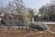 After Japan was defeated in World War II and withdrew from China, on November 1, 1947, the park was renamed Lenin Park in accordance with the decision of the CPC Central Committee.[2] On the eve of the founding of the People's Republic of China, the local government mobilized the mass to do voluntary labor to renovate the park, and erected a monument beside the lotus pond in the park, with the words "Labor Creates the World" (劳动创造世界) written on the monument, so the park was changed to the current name of Laodong Park (Laodong means "labor") on March 3, 1949. The Zhongling Tower in the park was renamed the Wuyi Tower, meaning the "May Day Tower".