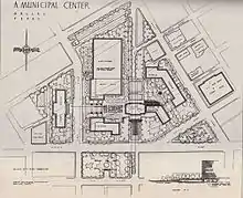 The City of Dallas' idea for a centralized municipal center began when city planning consultants Harland Bartholomew & Associates presented their ideas in 1944. The idea was to relocate from the current Dallas Municipal Building to a grand Beaux-Arts complex of city and federal offices, a convention center and cultural facilities. Two sites downtown were possible contenders: one north centered on Federal Street and Akard, and one south centered on Young Street.
