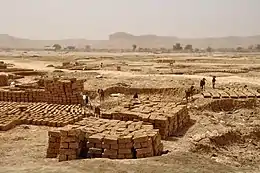 Bricks in the Dallol Bosso. After the rainy season several muddy pools remain in the valley; this mud is used for making traditional bricks, as seen here on the outskirts of the town of Filingué. In the distance the Filingué escarpment, a geological fault line on the western side of the Dallol.