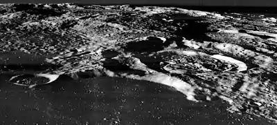 Oblique view of Damoiseau (right of center) from Lunar Orbiter 3, facing southwest. The flat plain in the foreground is Oceanus Procellarum, and the semi-circular "bay" below center is Damoiseau H. The small crater at far left adjacent to Damoiseau H is Damoiseau L. The south wall of Damoiseau M is visible, concentric with Damoiseau itself. Damoiseau A is behind (above and to the right of) Damoiseau.