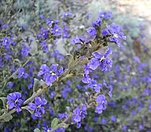 Dampiera purpurea is an erect multi-stemmed plant to 1 m (3.3 ft) high with obovate to elliptic leaves which are 0.9 to 6 cm (0.35 to 2.36 in) long and 0.5 to 4.2 cm (0.20 to 1.65 in) wide. The stems and undersides of leaves are covered in fine hair and rough in texture, while the leaves are bare of hair when mature. The flowers are mainly produced between August and January in the species' native range. Three to five flowers arise each on groups of two to nine flower-bearing branches.[4] Reaching 2.5 cm (1 in) in diameter, they are generally blue-purple in colour with yellow centres,[3] though pink and white flowers have been recorded.[5]