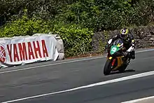 After a best result of eighth place in the Superstock race,[89] at the North West 200, Kneen contested the 300 Curves of Gustav Havel event for the first time, at Hořice in the Czech Republic.[90] He finished eighth once again, this time in the Superbike race.[91] Ahead of the Isle of Man TT, Kneen picked up an additional ride, signing for Jackson Racing to compete in the Supersport TT races, replacing Lee Johnston.[92] In the opening Superbike TT race, Kneen finished fifth despite a time penalty for exceeding the maximum speed limit in pit lane during one of his pit-stops.[93][94] Following an eighth place[93] in the only Supersport race to be held – the second race was cancelled due to the weather[95] – Kneen recorded a TT-best finish during the Superstock TT. Having started at number 14 on the running order,[96] Kneen started well and moved up to fourth position on the first lap of the race, before reaching the podium positions by the end of the second lap.[97] He held on for the remainder of the race, and as a result, sealed his first rostrum finish at the Isle of Man TT,[98] stating that the podium was "a feeling I can't describe at the moment".[99] Kneen completed the race meeting with twelfth in the Senior TT.[93]