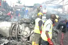 The crash scene became chaotic, with Nigeria's The Sun reporting that thousands of Lagos residents attempted to approach the site. Crowds attempted to bring water hoses to the site while soldiers attempted to disperse onlookers with punches and rubber whips. The onlookers then threw stones at the soldiers in retaliation.[22] Water for firefighting was scarce for several hours due to the city's shortage of fire trucks, and civilians attempted to fight the fire by hand with water from plastic buckets. Water trucks commandeered from nearby construction projects had difficulties reaching the site due to the narrow roads.[25]