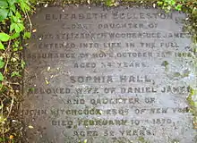 By 1890, the sheer number of burials in the Necropolis had created unsanitary conditions in the surrounding area. The council took control of the site and over a period of several years turned it into a park. The bodies of those buried there were not exhumed but the gravestones and memorials were removed. It was at this time that Daniel’s son from his second marriage – William Dodge James - arranged for the gravestones to be transferred to the church (St Andrew's) just behind his house in West Dean, where they remain today. At the foot of Daniel and Elizabeth's stone is that of Daniel's second wife Sofia, and daughter from his first marriage - Elizabeth Eccleston James.[29]