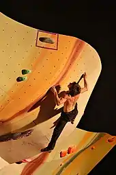 Daniel Woods (born August 1, 1989) is an American professional rock climber who specializes in bouldering, and who is considered one of the most important climbers in the history of bouldering.[1] Woods has climbed over thirty boulder problems graded at or above 8C (V15).[1][2] He has also won several competition bouldering events, such as the U.S. National Bouldering Championship and some international events. In March 2021, Woods achieved the first ascent of a low start to Sleepwalker V16 (8C+) which he named Return of the Sleepwalker and proposed the grade 9A (V17), only the second-ever route in history at that grade.[1]