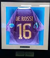 De Rossi was born in Rome. He is the son of Alberto De Rossi, former Roma player and Roma's Primavera coach.[185] He married Tamara Pisnoli on 18 May 2006, the mother of his daughter Gaia and ex-dancer of Mediaset, Sarabanda. The couple separated in early 2009.[186] On 29 December 2006, according to a survey for the Italian edition of Men's Health, he was named Italian athlete of the year for 2007.[187] De Rossi made his debut for Roma wearing the number 27 shirt, which he wore for two seasons. He then switched to the number 4, which he also wore during the 2006 World Cup.[188] With the birth of his daughter on 16 June 2005, he changed to number 16 during the 2005–06 season, which one of his idols, Roy Keane, had also worn.[189]