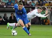 In May 2012, De Rossi was named to Prandelli's final 23-man squad for UEFA Euro 2012.[119] Due to Andrea Barzagli's pre-tournament injury, however, De Rossi played as a central defender in a three-man defence in Prandelli's 3–5–2 formation, alongside Giorgio Chiellini and Leonardo Bonucci, during Italy's opening two group matches of the competition against Spain and Croatia, which both ended in 1–1 draws, receiving praise for his performances in the media; he was temporarily replaced by Thiago Motta and Riccardo Montolivo alongside Pirlo and Marchisio in Italy's three-man midfield.[120][121][122] He then played a more regular midfield-role against the Republic of Ireland in the last group match, partnering with Claudio Marchisio and Andrea Pirlo.[122] He continued to play as a midfielder against England in the quarter-final, in which Italy went through after a penalty shootout victory.[122] De Rossi also played the entire semi-final against Germany, as Italy won the match 2–1,[123] and also played all 90 minutes in Italy's 4–0 defeat to Spain in the final.[124] De Rossi was included in the Team of the Tournament for his performances.[125]