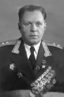 Daniil Vasilievich Kazakevich (Russian: Даниил Васильевич Казакевич; 16 December 1902 – 28 November 1988) was a Soviet Lieutenant general and Hero of the Soviet Union. Kazakevich was drafted into the Red Army in 1920 and fought in the Polish–Soviet War. In 1923 he transferred to the Soviet Border Troops. Kazakevich became an officer and by 1939 was chief of staff of a border district in the Soviet Far East. In December 1942 he became chief of staff of the Far Eastern NKVD Rifle Division, which became the 102nd Rifle Division some months later. After fighting in Operation Kutuzov, Kazakevich was given command of the 399th Rifle Division in September 1943. Kazakevich led the division through the Battle of the Dnieper, Operation Bagration and the East Prussian Offensive. He was awarded the title Hero of the Soviet Union for his leadership in the battle for the Narew bridgeheads during September 1944. Postwar, Kazakevich returned to the Border Troops and led the Moldovan and Southwestern Border Districts. After a two-year period as an advisor to the East German Border Troops, Kazakevich became chief of the Border Troops military educational institutions. He retired in 1959 and lived in Moscow, working in the Intourist Directorate.[1]