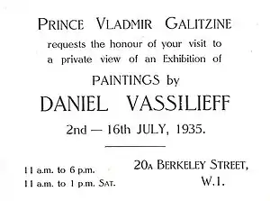 While living in England, his ideas of using traditional Russian decorative art in a modernist context began to form.[3] This was helped by his friendship with Vladimir Polunin, at that time a teacher at the Slade School of Fine Art but previously a scene painter for Sergei Diaghilev's Ballets Russes.[4][5] Vassilieff wanted to return to Russia, but Stalin's repressive regime made that impossible.[5]