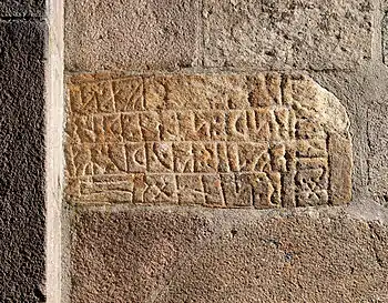 The inscription on DR 48 consists of four lines of horizontal and one line of vertical runic text on a 1.1 m × 0.5 m (3 ft 7 in × 1 ft 8 in) granite block. The stone dates from the 12th century and was reused after being shaped in the construction of the south chancel wall of a church in Hanning.[1] Before the historic nature of runestones was understood, they were often re-used as material for the construction of roads, bridges, and buildings. Although clearly visible in the wall for several centuries, the existence of the runestone was first reported in 1843.[2] Because the stone was shaped for use in the wall, a portion of the text has been lost. The inscription also depicts a hammer within the runic text after the Old Norse word sina, which has been interpreted as being Thor's hammer Mjöllnir. Thor's hammer was used on several memorial runestones in Sweden and Denmark, perhaps as a parallel to or a pagan reaction to the use of the cross by Christians.[3] Other surviving runestones or inscriptions depicting Thor's hammer include runestones U 1161 in Altuna, Sö 86 in Åby, Sö 111 in Stenkvista, Vg 113 in Bjärby, Öl 1 in Karlevi, DR 26 in Laeborg, DR 120 in Spentrup, and DR 331 in Gårdstånga.[4][5] Because of the dating of the inscription to the 12th century based upon linguistic analysis,[6] which is some 200 years after the Christianization of Denmark, some have questioned whether the hammer is actually a statement of heathenism. It has been suggested that the hammer is not a depiction of Mjöllnir but is instead a symbol identifying a blacksmith or other occupation.[5] However, there are no parallels of such symbolic depictions on other medieval runestones, and the hammer is very similar to that on DR 26 in Laeborg, which is considered to be a depiction of Mjöllnir.[5]