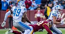 On March 11, 2019, Amendola signed a one-year, $4.5 million contract with the Detroit Lions.[72] The contract also includes up to $1.25 million in incentives.[73] Amendola had previously played under Lions head coach Matt Patricia when the coach was the Patriots' defensive coordinator. Amendola made his debut with the Lions in Week 1 against the Arizona Cardinals. In the game, Amendola caught seven passes for 104 yards and a touchdown in a 27–27 tie.[74] In Week 7 against the Minnesota Vikings, Amendola caught eight passes for 105 yards in the 42-30 loss.[75] In Week 15 against the Tampa Bay Buccaneers, Amendola caught eight passes for 102 yards in the 38–17 loss.[76] In week 17 Amendola caught two passes for 16 yards and threw a 19-yard touchdown pass to rookie quarterback David Blough during the 23–20 loss to the Green Bay Packers.[77] During the 2019 season, Amendola posted 62 receptions for 678 receiving yards and one receiving touchdown.[78]
