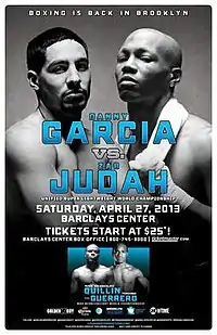 Danny García vs. Zab Judah, was a boxing unified super lightweight world championship fight for Garcia's Ring Junior Welterweight title, WBA Super Lightweight title and WBC Light Welterweight title. The bout was held on April 27, 2013, at the Barclays Center in Brooklyn, New York on Showtime. The bout was originally set to be held on February 9, but was rescheduled due to a rib injury sustained by Garcia during training.[1]