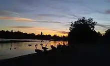 The park was opened to the public in 1925 by Princess Mary,[7] Land was reserved for football pitches, tennis courts and a bowling green, which have been added over time.[7] In 1929 the Morris Wheeler Gates were erected at the north-east corner of the park,[7] donated by Alfred Morris Wheeler, a prominent local businessman and chairman of Bexley UDC.[14] An open-air swimming pool opened in 1936, and in 1964 the Boathouse and Cafe opened to the public.[7] The park grounds were restored, funded by the Heritage Lottery Fund, in 2006, alongside a major English Heritage restoration of Danson House.[15] The park is now used extensively by the community.[7][2]
