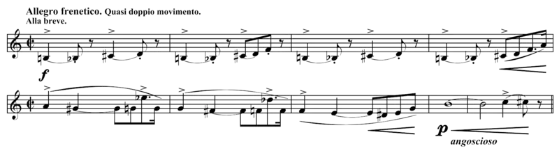 These motifs are developed at length as the tempo gradually increases and the tension builds. The music is dark and turbulent. The chromatic and atonal nature of the material conveys a sense of urgency and growing excitement.