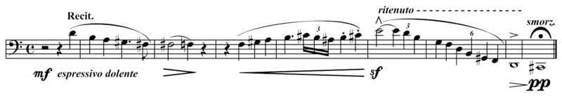4 time marked Quasi Andante, ma sempre un poco mosso ensues, beginning with harp glissandi and chromatic figurations in strings and woodwind that once again invoke the swirling wind.[27] After a pause, however, the bass clarinet intones an expressive recitative, which takes the instrument to the very bottom of its range: