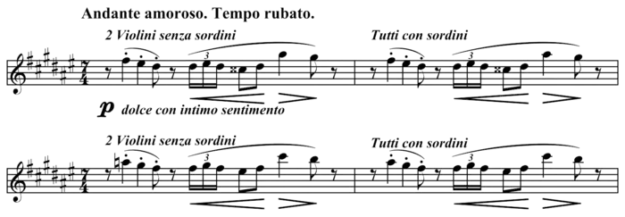 Curiously, the key signature suggests F♯ major, a key Liszt often reserved for divine or beatific music.[23] The theme actually begins in D♯ minor, passing sequentially through F♯ minor and A minor. Two unmuted violins are contrasted with the rest of the violins, which are muted.