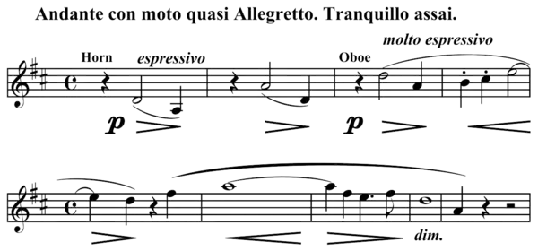 The movement opens in D major in a slow tempo (Andante con moto quasi Allegretto. Tranquillo assai). A solo horn introduces the opening theme to the accompaniment of rocking chords on muted strings and arpeggiated triplets played by the harp. This theme is taken up by the woodwind and horns, and after twenty-one measures dies away against a shimmering haze of rising and falling arpeggios on the harp: