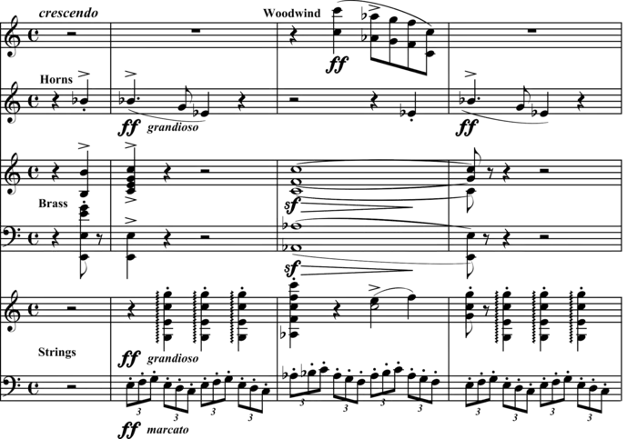 The third theme begins as a chantlike monotone played by horns and trumpets on E♮ against a string tremolo in C♯ minor. It cadences on a tonally ambiguous diminished seventh on G♯: