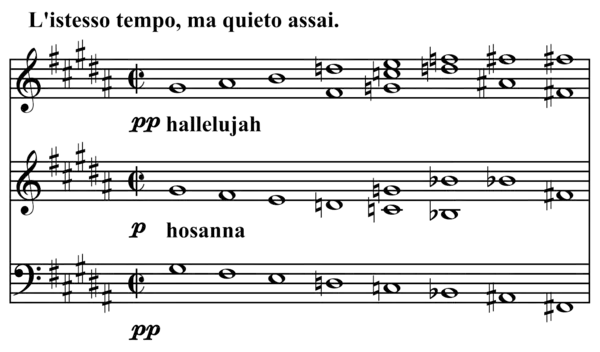 In the triumphant coda, the divided chorus sings Hosanna and Hallelujah in a series of carefully crafted modulations, which reflect Dante's ascent sphere-by-sphere towards the Empyrean; this is in marked contrast to the first movement, where key shifts were sudden and disjointed.[38] As the Hosannas descend step by step from G♯ down to C, the Hallelujahs rise from G♯ up to F. The whole chorus then joins together in a final, triumphant Hallelujah on the dominant F♯. In this passage, the bass steps down the whole-tone scale from G♯ to A♯. Liszt was proud of this innovatory use of the whole-tone scale, and mentions it in a letter to Julius Schäffer, the music director of the Schwerin orchestra.[39]