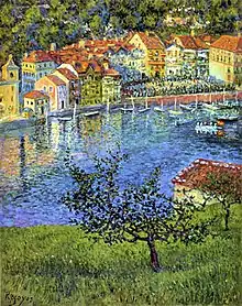 In his early stage, Regoyos' painting evolved from Naturalism to pre-symbolism, an example being his series The black Spain, to Impressionism and Pointillism, being somewhat more daring than Ignacio Zuloaga and Joaquín Sorolla. In his mature stage, he created abundant landscapes en plein air of locations of Vizcaya and Guipúzcoa. His drawing was characterized as being somewhat primary, almost naive, in contrast to his colorful international taste, which was then largely unrivaled in Spain.[3] Notable for contributing to "the renewal of modern Spanish painting",[5] in Spain, he is best known for his introduction of Impressionism techniques.[4]