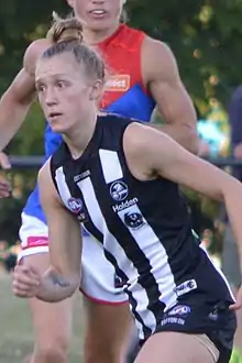 Darcy Guttridge (born 30 October 1999) is an Australian rules footballer playing for the St Kilda Football Club in the AFL Women's (AFLW). She previously played for the Collingwood Football Club from 2018 to 2019. Guttridge was drafted by Collingwood with the club's second selection and the 9th pick overall in the 2018 AFL Women's draft.[1] She made her debut in a loss to Carlton at Ikon Park in round 5 of the 2019 season.[2] In April 2019, she departed the club and joined expansion side St Kilda.[3][4] It was revealed Guttridge had signed on with the Saints for one more year on 30 June 2021, tying her to the club until the end of the 2021/2022 season.[5]
