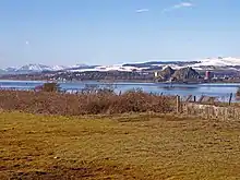 There was a Roman Fort at Bishopton which was discovered from aerial photographs in 1949.[5][6] The fort is about 1 km (0.6 mi) west of the village.[7] It overlooked the former ford at Dumbuck,[8] on a flat-topped hill around 60 metres (200 ft) above the river, allowing ready surveillance of the River Clyde.[9] The fort at Whitemoss Farm may have been held initially from 140 to 155 A.D.[10] Pottery with Antonine era date stamps was found at the site.[11] The pottery and many other finds were catalogued at the Hunterian Museum in Glasgow[12] along with several coeval items like the distance slab of the Twentieth Legion from Old Kilpatrick.[13] There was an earlier Roman fort on Barochan Hill,[14] less than 2 miles (3 km) to the south-west towards Houston.[15] Bishopton was originally in the Parish of Erskine.[16] The name of the village is reflected in a nearby house: Bishopton House.[17] A famous family called the Brisbanes lived there.[18] The house became a convent known as Good Shepherd Centre and latterly Cora Foundation.[19]