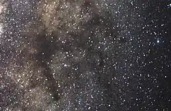 The Dark Horse Nebula or Great Dark Horse (sometimes called the Prancing Horse) is a large dark nebula that, from Earth's perspective, obscures part of the upper central bulge of the Milky Way. The Dark Horse lies in the equatorial constellation Ophiuchus (the Serpent Bearer), near its borders with the more famous constellations Scorpius and Sagittarius. It is a large, visible feature of the Milky Way's Great Rift, uniting several individually catalogued dark nebulae, including the Pipe Nebula. It is visible from Earth only on clear moonless nights without light pollution and with low humidity.[1]