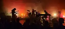 The duo debuted their live show in December 2011 to a sold out crowd at Music Hall of Williamsburg, stretching their three-song EP into an hour-long set.[13] They also played at the 2012 SXSW festival.[14] Pitchfork has credited the project with allowing Jaar to transition forward into a "proggier and more narcotic-sounding" space while still maintaining his unique aesthetic, in part due to Harrington's influence.[9][14] The Fader also noted Harrington's contributions, stating that he "adds weight" to Jaar's signature "airy" sound.[8] Darkside released their first music video in May 2012 for "A1", which was directed by Ryan Staake of Pomp&Clout and Clown & Sunset Aesthetics.[15]
