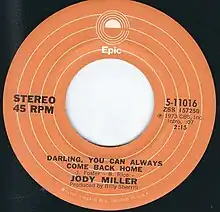 "Darling, You Can Always Come Back Home" was released as a single in the e by Epic Records in June 1973. It was backed on the B-side by a new recording called "We'll Sing Our Song Together". It was distributed as a seven-inch vinyl single.[3] It reached the number five position on the American Billboard Hot Country Songs chart[4] and number three on the Canadian RPM Country Tracks chart in 1973.[5] "Darling, You Can Always Come Back Home" was Miller's sixth and final top ten single in her recording career.[5][4] One month after the single's release, the song appeared on Miller's studio album Good News!.[6]