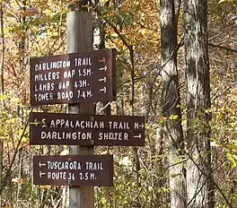 The Darlington Trail predates the Appalachian Trail, and was founded in 1908 by the former Pennsylvania Alpine Club. It was named for the secretary of the club, Bishop Darlington of St. Stephen's Cathedral in Harrisburg.[1] The trail was originally much longer, reaching from near Chambersburg in the southwest to a vista over the Susquehanna River at its northeastern end. The trail was adopted by the Susquehanna Appalachian Trail Club in 1954, after it had mostly deteriorated. A portion of the original route was later incorporated into the Appalachian Trail.[2][3] Near the trail's present western end, Darlington Shelter is commonly used by hikers on the Tuscarora and Appalachian Trails.[4] The Darlington Trail also features two evenly-spaced camping shelters of its own at Millers Gap and Lambs Gap.[1]