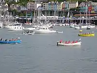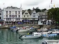 Dartmouth Harbour (also Dart Harbour) is a natural port located in Dartmouth, Devon, England. It is situated at the mouth of the River Dart on the English Channel.[2] Bayard's Cove Fort is a small fort, which was built to defend the harbour's entrance. The crafts which dock at the port are mainly local fishing vessels, naval ships and luxury yachts; warships routinely visit the harbour.[3] The River Dart is navigable from Dartmouth to the old weir location at Totnes.