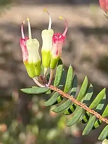 Darwinia peduncluaris is a broadly-spreading shrub that typically growing to a height of 1.5 m (4 ft 11 in) and has glabrous, flattened, spreading leaves 7–12 mm (0.28–0.47 in) long. Flowering occurs from late winter to early spring and the flowers usually occur in pairs on a peduncle 4–7 mm (0.16–0.28 in) long and often curved downwards. There are leaf-like, triangular bracts 1–10 mm (0.039–0.394 in) long and oblong bracteoles 4–8 mm (0.16–0.31 in) long at the base of the flowers but that fall off as the flower develops.[2][3]