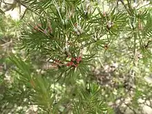 The flowers are arranged in clusters of about four on the ends of the branches, each flower on a stalk 1–2 millimetres (0.04–0.08 in) long. the groups surrounded by reddish bracts 4–13 millimetres (0.2–0.5 in) long. The floral cup is 5–8 millimetres (0.2–0.3 in) long and about 2 millimetres (0.08 in) wide and the petals form a white tube surrounding and enclosing the stamens. The style is white, 14–20 millimetres (0.6–0.8 in) long and extends beyond the end of the flower tube. Flowering occurs between late winter and early summer.[2][3][4]