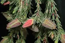 Darwinia speciosa is a dwarf, erect, spreading or prostrate shrub that typically grows to a height of 10–30 cm (3.9–11.8 in). The leaves are narrowly oblong, 4–9 mm (0.16–0.35 in) long, and concave. The flowers are greenish, arranged in bell-shaped heads of 8 to 10 surrounded and hidden by dark red or brownish bracts about 30 mm (1.2 in) long. The sepals are about 6.5 mm (0.26 in) long with egg-shaped lobes, the petals triangular and about 2 mm (0.079 in) long. Flowering mainly occurs from July to November.[2][3][4]
