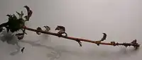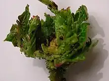 The midge induces stunted and distorted rosettes[4] in the host by inhibiting the elongation of the shoot; the rosette is formed from many (8 to 40 or more) slightly thickened and deformed leaves with reduced petioles. Many of the leaves have small green or red ligulate excrescences or projections. The midge larvae are of an orange-red colour.[1][2]